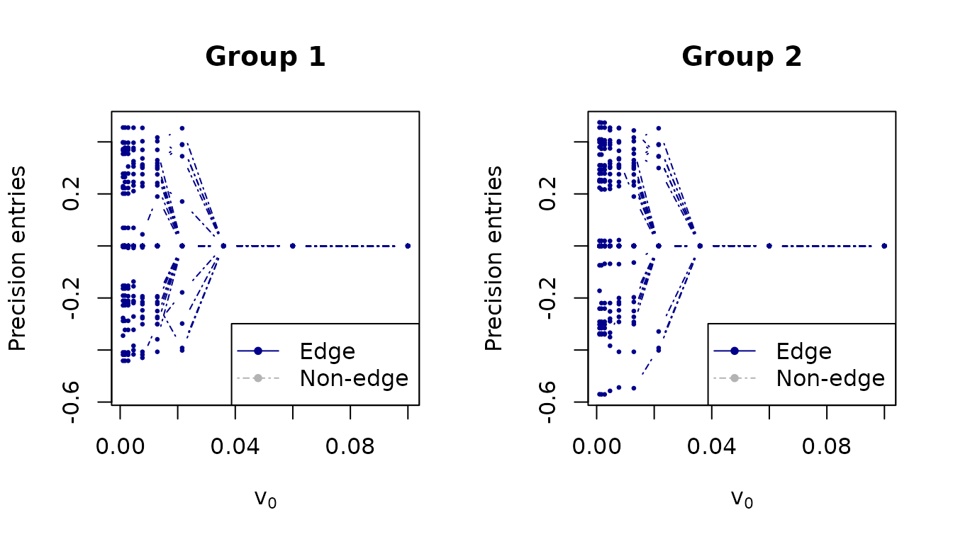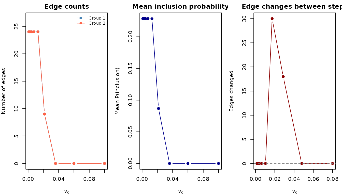 #> Group 2: 31 nonzero edges, |pcor| range: [0.269, 0.269]Fitting across the v0 ladder